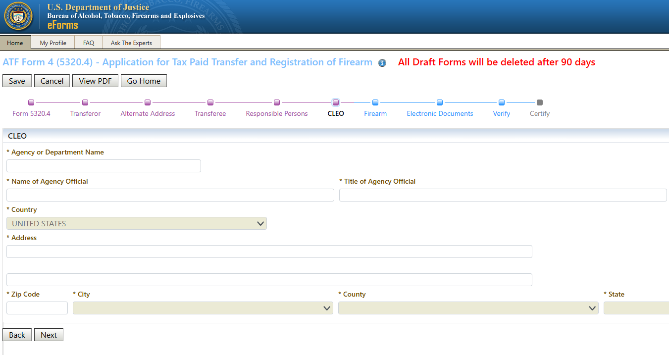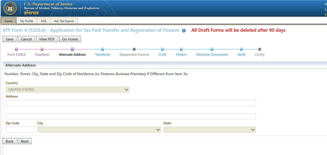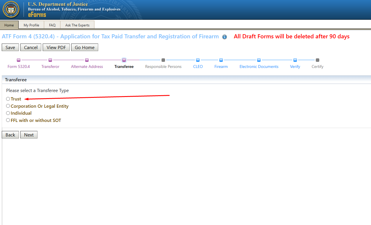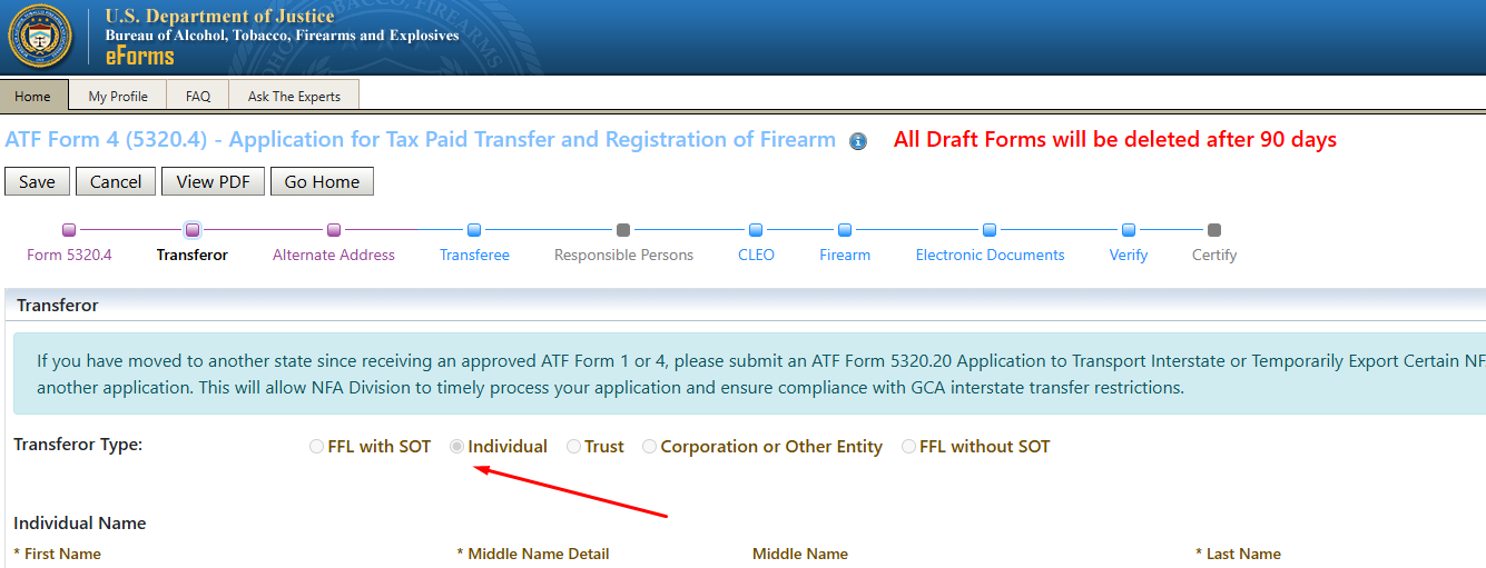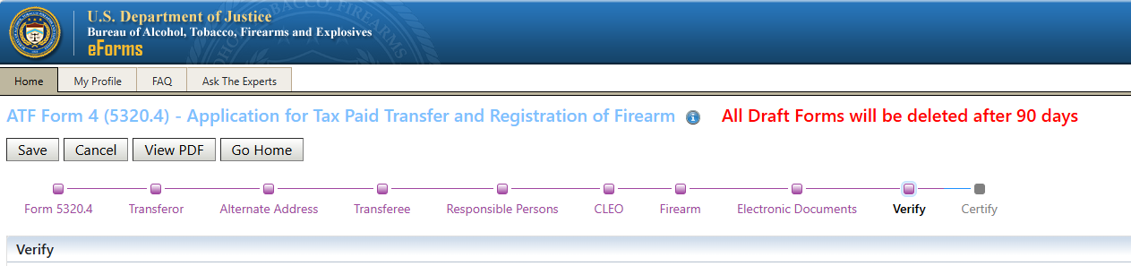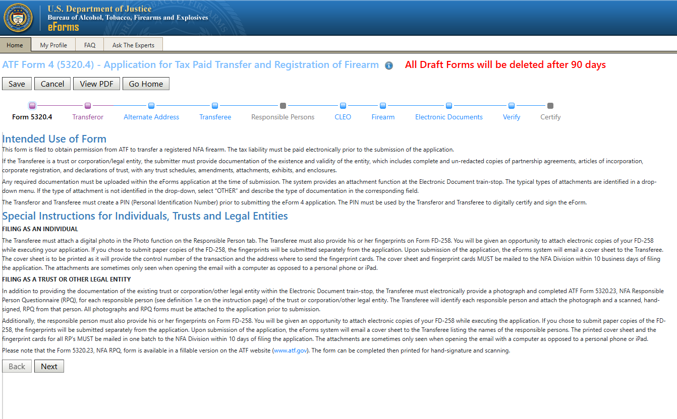 Once you have confirmed how your name is entered in your profile, return to the Home screen and click on ATF Form 4 to start the transfer process: