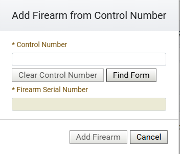 Depending on whether or not you can read the control number on the existing stamp (in the header for most versions of the tax stamp dopcuments), there are 3 ways to look up the control number. Once you have the control number, you click the button the says ‘Add Firearm from Control Number‘.