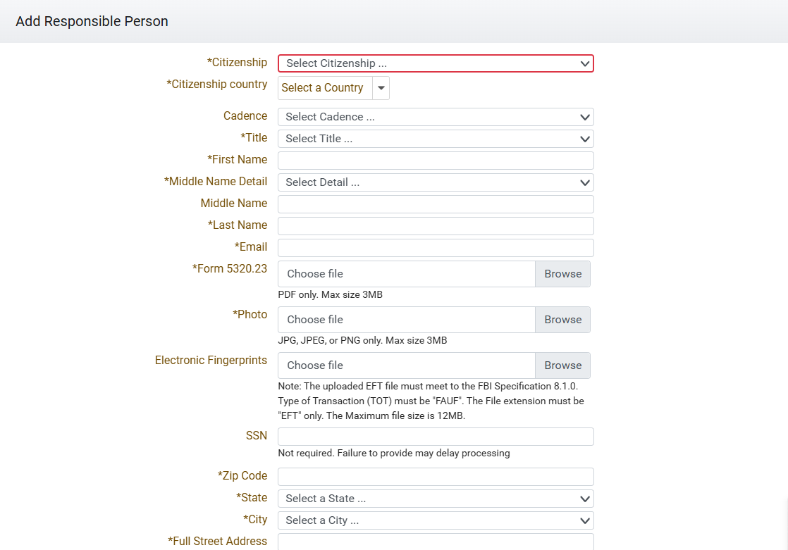 This is where you will upload your completed Form 23 as well as your passport-style photo and electronic fingerprints (.eft) file.