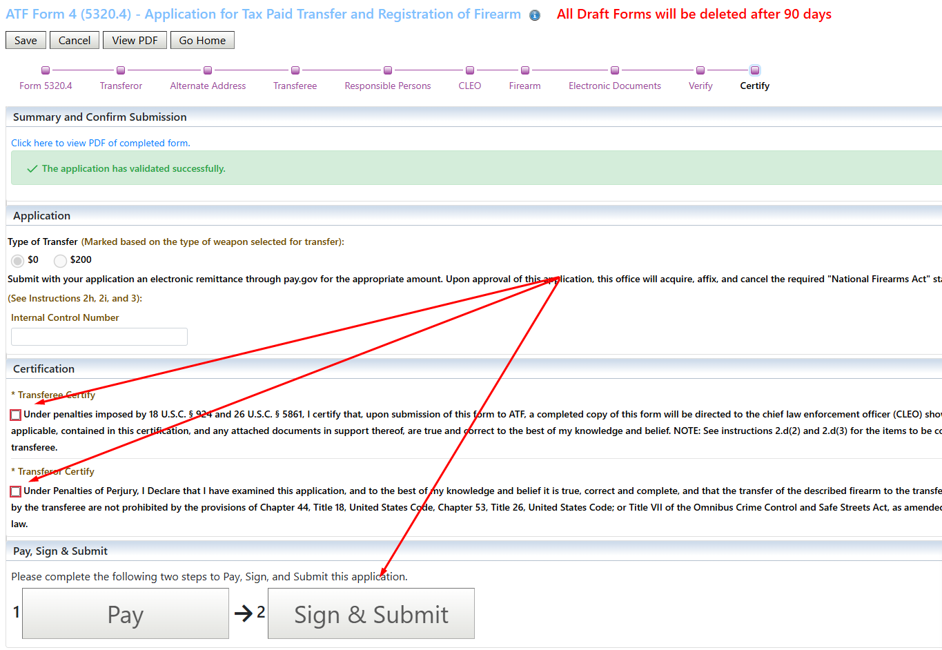 This brings you to the last screen in the chain where you will check the boxes certifying the information under penalty of perjury. After you have done so, you click the ‘Sign and Submit‘ button. You do not need to pay for suppressors or SBRs. If you are doing a machinegun then you will need to click the ‘Pay‘ button and make payment prior to doing the Sign and Submit step.