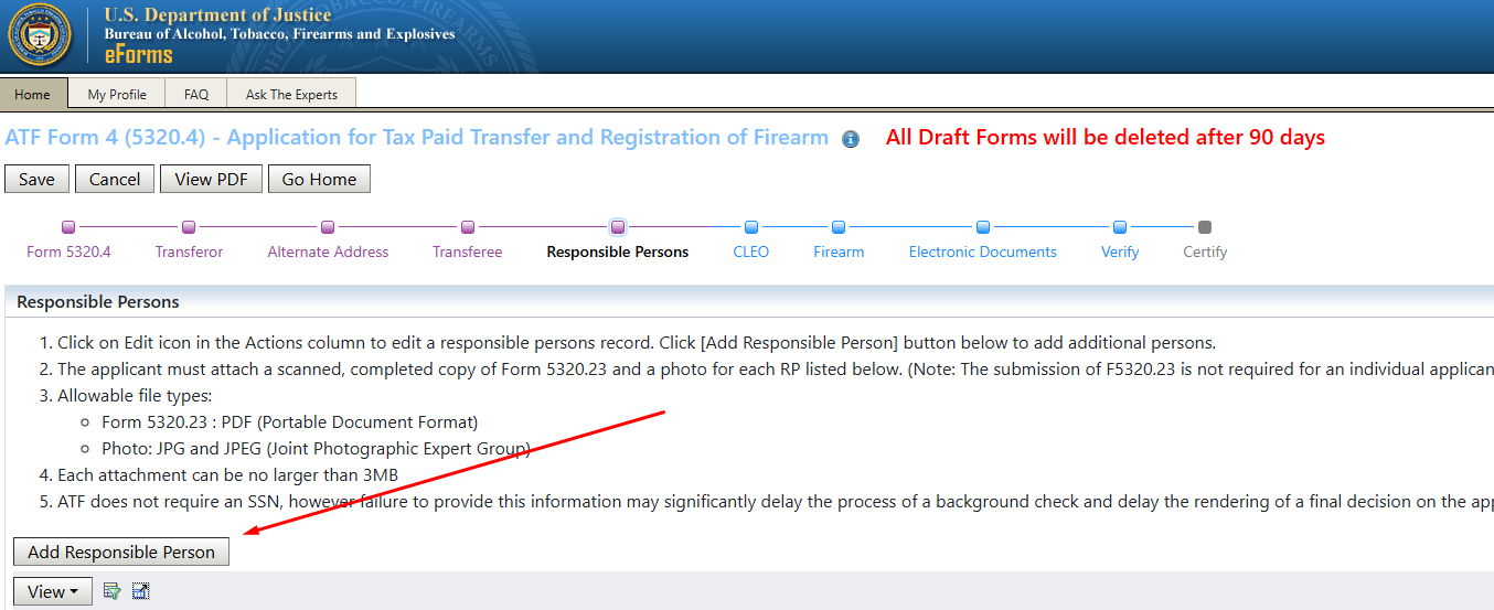 The next screen is the Responsible Person page. You will need to add your information here and that of any person on your Schedule B at the time of the submission of the application. If you want to remove those persons prior to starting your application, please reach out to me and we will update your schedule B.